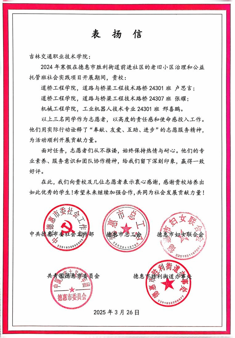 本次校社共建交流会的圆满举行,是校社协同育人与服务地方的生动实践,标志着道桥工程学院与德惠市胜利街道前进社区的合作迈入新阶段。下一步,双方将以“党建引领、专业赋能、服务地方”为核心理念,进一步加强合作,探索志愿服务常态化、品牌化发展路径,着力推进志愿服务向制度化、专业化方向转型升级,携手谱写新时代校社共建共赢的新篇章。