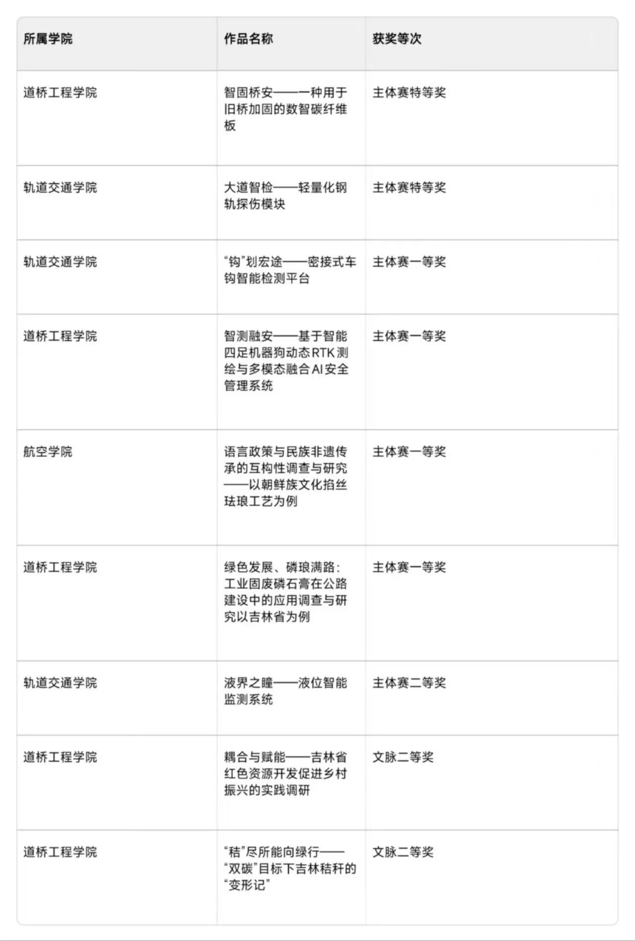 近日,2025年吉林省“挑战杯”大学生课外学术科技作品竞赛在延吉市圆满落幕,我校在此次大赛中表现卓越,再创佳绩。2025年“挑战杯”省赛自启动以来,吸引全省59所高校、3万余名学子踊跃参与,申报项目达8988个。经资格审查、复赛、终审决赛等多轮评审,我校成绩令人瞩目,与本科院校同台竞技,获得省赛特等奖2项、一等奖4项、二等奖3项、三等奖7项,学校凭借出色的组织工作和优异的竞赛成绩,成功捧得优胜杯(全省共20所院校其中3所高职院校捧杯),项目与23年大挑省赛一等奖1项、二等奖1项的成绩相比数量和质量均有大幅度提升,为学校赢得了荣誉。在省赛环节,我校推荐的12件优秀作品中,7个主赛道项目及2个文脉吉林项目进入省赛入围赛答辩现场环节,为吉林省高职高专院校首位,展现了学校在科技创新领域的人才培养实力。目前2项特等奖项目推报至国赛环节。